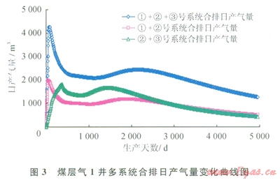 ①號系統(tǒng)和②號系統(tǒng)合排,最高產(chǎn)氣量約為2000m3/d,平均產(chǎn)氣量為950m3/d左右,1000m3/d產(chǎn)量可持續(xù)2800d左右(圖3),15a累計產(chǎn)量為4.68×106m3;②號系統(tǒng)和③號系統(tǒng)合排,最高產(chǎn)氣量也在2000m3/d左右,平均產(chǎn)氣量為1100m3/d左右,1500m3/d日產(chǎn)量持續(xù)2000d左右,15a累計產(chǎn)量為5.39×106m3;①、②、③這3個系統(tǒng)合排,最高產(chǎn)氣量達(dá)到4300m3/d,平均產(chǎn)氣量為2100m3/d左右,2000m3/d產(chǎn)量可持續(xù)3300d左右,l5a累計產(chǎn)量為10.45×106m3。實(shí)際排采時由于各系統(tǒng)壓力不同,系統(tǒng)間相互干擾,并非所有含氣系統(tǒng)都有產(chǎn)能貢獻(xiàn)。