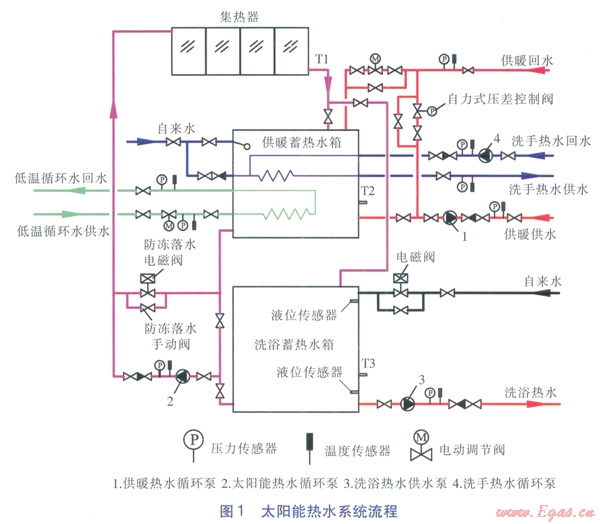 太陽能熱水系統(tǒng)由集熱器、循環(huán)泵、供暖蓄熱水箱、洗浴蓄熱水箱、輔助熱源(低溫循環(huán)水供暖系統(tǒng))、控制系統(tǒng)組成,流程見圖l。