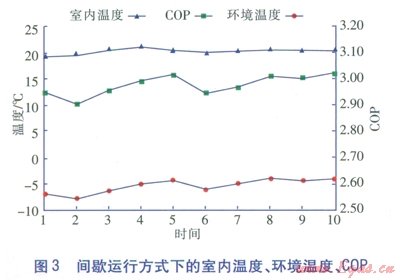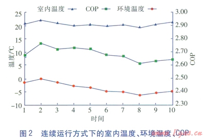 連續(xù)運(yùn)行方式的實(shí)驗(yàn)時(shí)間為l個(gè)月,每天運(yùn)行24h,每小時(shí)監(jiān)測(cè)記錄一次。以每3天為單位取室內(nèi)溫度、COP、環(huán)境溫度平均值,結(jié)果見(jiàn)圖2。其中橫坐標(biāo)值1代表實(shí)驗(yàn)的第l~3天,2代表實(shí)驗(yàn)的4~6天,依此類推。在此運(yùn)行模式期間,平均室外溫度為-3.47℃,最低日平均溫度為-6.6℃,最高日平均溫度為0.0℃,太陽(yáng)輻射平均日總量為2353W/m2,集熱器平均日集熱總量為l411.8W/m2,室內(nèi)溫度在19.2~22.7℃范圍內(nèi)變化(平均達(dá)21.15℃),系統(tǒng)的平均COP達(dá)2.689,COP最低為2.614,最高為2.782。從圖2可知,系統(tǒng)連續(xù)運(yùn)行時(shí)的供暖溫度始終在人體舒適的溫度范圍內(nèi)波動(dòng),但是系統(tǒng)的COP值較小,說(shuō)明能耗還可以進(jìn)一步降低。