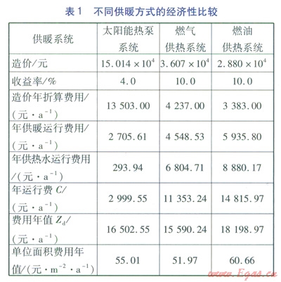 由表l可知,對(duì)于單位面積費(fèi)用年值,太陽(yáng)能熱泵系統(tǒng)比燃?xì)夤嵯到y(tǒng)高5.5%,比燃油供熱系統(tǒng)低10.3%。但是綜合考慮環(huán)境保護(hù)、能源消耗、系統(tǒng)可調(diào)性和長(zhǎng)期回報(bào),太陽(yáng)能熱泵低溫輻射供暖系統(tǒng)還是具有較大的市場(chǎng)潛力。