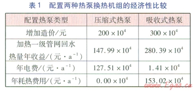 配置兩種熱泵換熱機(jī)組的經(jīng)濟(jì)性比較見表l,熱價(jià)按57.92元/GJ計(jì)算,電價(jià)按0.854元(kW·h)計(jì)算。由表1可計(jì)算得,配置壓縮式熱泵的換熱機(jī)組年凈收益為20.48×104元/a,增加造價(jià)200×104元,投資回收期約l0a。配置吸收式熱泵的換熱機(jī)組年凈收益為l25.96×104元/a,增加造價(jià)300×104元,投資回收期約3a。