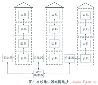 本方式通過小區(qū)內(nèi)加裝GPRS集中器,南集中器控制多個樓棟的采集器發(fā)起組網(wǎng)集抄。采集器根據(jù)集中器的命令,發(fā)起和中繼器、表具的組網(wǎng)過程并回傳數(shù)據(jù)。組網(wǎng)方式和現(xiàn)場組網(wǎng)集抄方式相同,唯一的不同在于不需要抄表人員到現(xiàn)場用于持機發(fā)起集抄,(見圖5)。