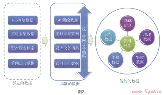如何才能把不同種類的數(shù)據(jù)利用物理或者邏輯的方式集成起來?答案是通過統(tǒng)一的管網(wǎng)設備設施編碼,它同樣是智能燃氣網(wǎng)標準化建設體系里面的重要內(nèi)容。北京燃氣集團從多年前就開始管網(wǎng)設備設施和物資體系的標準化工作,如存GIS地理信息系統(tǒng)里面就已經(jīng)采用了l5位的統(tǒng)一管網(wǎng)編碼,但大部分業(yè)務系統(tǒng)設備設施的編碼體系還不完全一致,需要轉換或者對照才能把這些業(yè)務數(shù)據(jù)關聯(lián)起來。圖3足數(shù)據(jù)從串聯(lián)到完全關聯(lián)的過程。