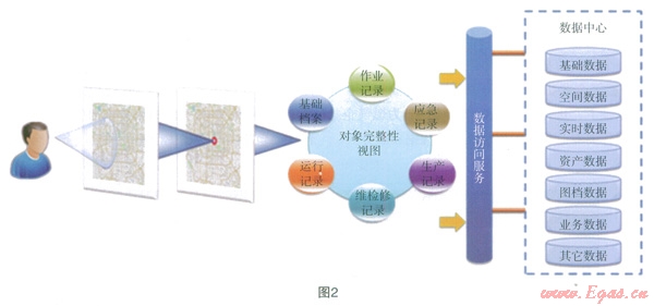 智能燃氣網(wǎng)企業(yè)私有云建設首先要解決的問題是數(shù)據(jù)的集成。燃氣企業(yè)運營數(shù)據(jù)主要包括地理數(shù)據(jù)、實時數(shù)據(jù)、管網(wǎng)完整性檔案數(shù)據(jù)、各類專業(yè)管理數(shù)據(jù)等,數(shù)據(jù)非常龐大,數(shù)據(jù)之間有著密切關聯(lián)。不同的數(shù)據(jù)存儲和訪問方式可能差別巨大,如GIS地理數(shù)據(jù)和實時數(shù)據(jù),都有各自鮮明的專業(yè)特點。由于這些差距,智能燃氣網(wǎng)企業(yè)私有云有自己的行業(yè)特點,數(shù)據(jù)的集成并不需要把這些完全統(tǒng)一存儲起來,而是在多個數(shù)據(jù)中心基礎上構建一個邏輯上的共享數(shù)據(jù)中心,為用戶提供對象統(tǒng)一訪問服務。如圖2所示。