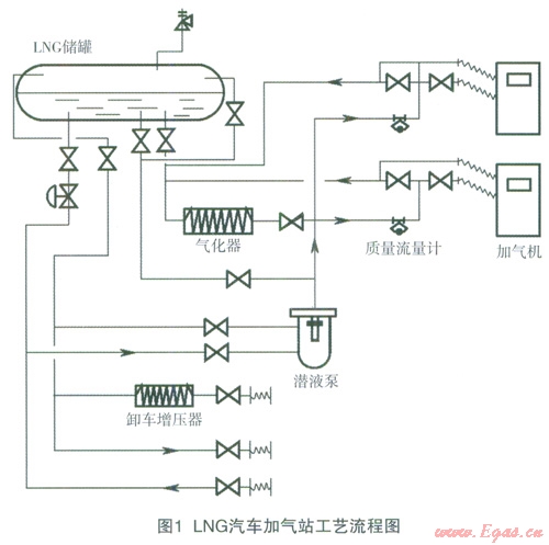 LNC汽車加氣站具有卸車、儲存、增壓、加氣等工藝過程,南此形成了相應的T藝流程,見圖l。
