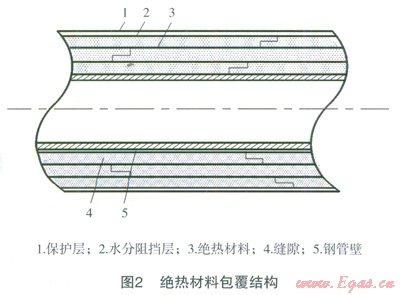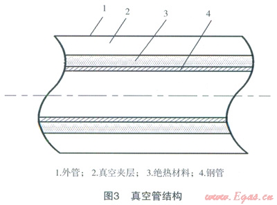 LNG槽車到站后,通常通過低溫泵法或增壓器法對槽車內(nèi)LNG增壓后將LNG卸入儲罐內(nèi)。不論采用哪種方法,LNG必須通過低溫管道進行輸送,在輸送過程中,LNG將吸收外界環(huán)境熱量而氣化,產(chǎn)生BOG。為了減少BOG的產(chǎn)生,通常利用兩種方法對低溫管道進行保冷處理,即絕熱材料包覆法和真空管法,這兩種方法結構如圖2、3所示[5]。