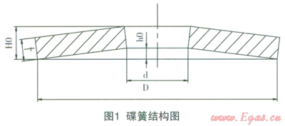 浮動碟簧采用了類似普通蝶形彈簧的碟形結(jié)構(gòu)。它用的是高彈性模量的合金材料加工而成。其結(jié)構(gòu)特點(diǎn):簧片較厚、拱高較小?;善穸?span lang="EN-US">t要比相同直徑大小的普通蝶形彈簧厚,而拱高h0則比相同直徑大小的普通蝶形彈簧的h0小。其結(jié)構(gòu)型式如圖1所示。