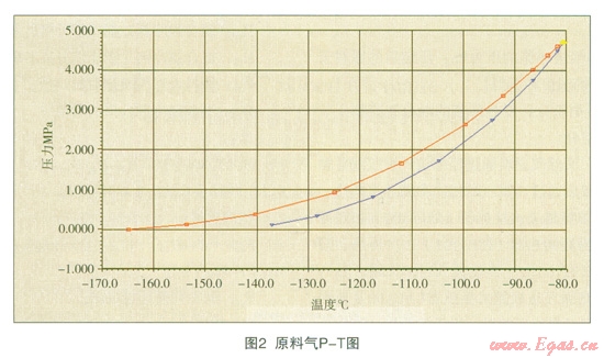 煤層氣液化過程實際上是一個氣態(tài)煤層氣等壓降溫成液態(tài)煤層氣的過程。從表1和圖2可以看出煤層氣的露點線和泡點線在壓力達到某一特定值時則交于一點,即臨界點。從圖3可以看出由于煤層氣是一種混合物,所以與純組分相比露點線與泡點線已不再足完全重合,說明在汽液兩相區(qū)煤層氣的溫度隨汽液比的降低而降低。