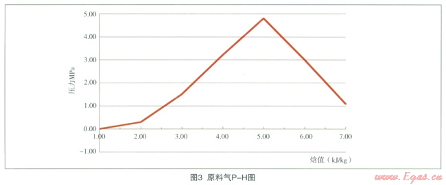 利用流程模擬圖可以原料氣P-T-H(P:壓力、T:溫度、H:焓值)的相關數(shù)據(jù),具體數(shù)據(jù)及曲線圖見表1、圖2、圖3。