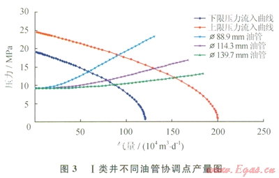 綜合考慮注采井協(xié)調(diào)點(diǎn)產(chǎn)量、沖蝕流量、攜液生產(chǎn)能力等因素。按照儲(chǔ)氣庫上限壓力(指地層壓力)24.6MPa、下限壓力l9.1MPa兩種情況,井口壓力6.4MPa,計(jì)算不同油管的最大合理產(chǎn)量。