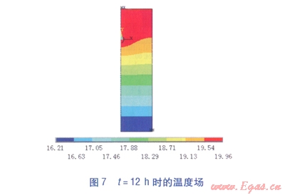通過有限元軟件模擬了管道氣密性試驗(yàn)過程24h內(nèi)的溫度場分布,不同時(shí)刻的溫度場分布見圖3~8,t為模擬的時(shí)間,云圖下方彩色標(biāo)尺的顏色深淺表示溫度的高低,數(shù)值表示溫度值,單位為℃。