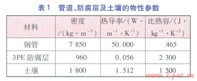 以規(guī)格為Æ219×6的20號(hào)鋼管為例進(jìn)行計(jì)算,采用3PE防腐,防腐層厚度為2mm,埋地深度h1為1m。管道、防腐層及土壤的物性參數(shù)經(jīng)現(xiàn)場測量,結(jié)果見表1。