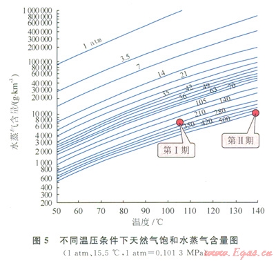 將2期充注成藏期的溫度、壓力投影至不同溫壓條件下天然氣飽和水蒸氣含量圖版上發(fā)現(xiàn)(圖5),在第Ⅰ充注期天然氣的攜水量介于5000~7000g/km3,在第Ⅱ充注期天然氣的攜水量介于l0000~12000g/km3,第Ⅱ期允注的天然氣攜水量是第Ⅰ期的近2倍,表明隨著溫度、壓力的增火火然氣攜水的能力鼴著增加,儲(chǔ)層中有更多的束縛水被蒸發(fā)氣化,不斷隨著天然氣的運(yùn)移攜帶出儲(chǔ)層,增大了地層水被攜帶到上覆地層的可能性[14],有利于超低含水飽和度氣藏的形成。