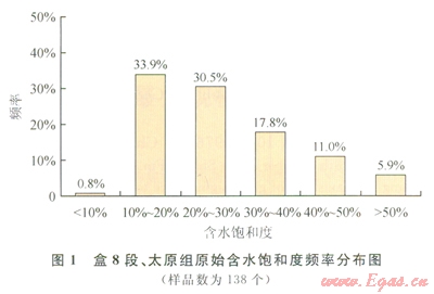 儲(chǔ)層原始含水飽和度由密閉取心井確定。通過統(tǒng)計(jì)、分析盆地東部3口密閉取心井盒8段、太原組的138個(gè)原始含水飽和度數(shù)據(jù),結(jié)果表明,盒8段、太原組的原始含水飽和度主要分布在40%以下,累計(jì)頻率町達(dá)83.1%,平均含水飽和度為26.7%(圖1)。具有較低的原始含水飽和度特征。