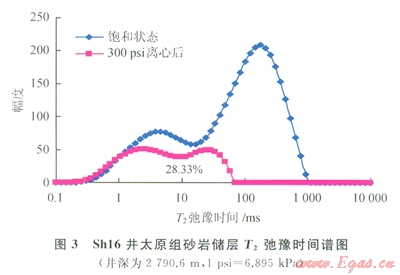 核磁共振呵動(dòng)流體實(shí)驗(yàn)原理是通過對(duì)儲(chǔ)層孔隙流體中氫核信號(hào)的觀測,可以贏接測量巖石中流體特性。并能獲得儲(chǔ)層有效孔隙度、自由流體和束縛流體體積、孔隙結(jié)構(gòu)等地質(zhì)信息[8-12]。巖心樣品飽和流體后置于均勻分布的靜磁場中,流體中的氫核(1H)會(huì)被磁場極化,產(chǎn)生磁化矢量,此時(shí)對(duì)樣品施加一定頻率的射頻場,就會(huì)產(chǎn)生核磁共振;撤掉射頻場就會(huì)接收到氫核在孔隙中做弛豫運(yùn)動(dòng)幅度隨時(shí)間以指數(shù)函數(shù)衰減的信號(hào)。核磁共振信號(hào)衰減的快慢采用橫向弛豫時(shí)間T2來描述,飽和流體的巖樣進(jìn)行核磁共振T2測試時(shí),T2弛豫時(shí)間的大小取決于流體分子受孔隙固體表面作用力的強(qiáng)弱,因此利用核磁共振了T2譜可對(duì)巖樣孔隙內(nèi)流體的賦存狀態(tài)進(jìn)行分析,能夠定量測試出可動(dòng)流體飽和度及束縛流體飽和度。圖3為Shl6井太原組砂巖儲(chǔ)層核磁共振實(shí)驗(yàn)的T2弛豫時(shí)間譜圖,可以確定,該砂巖儲(chǔ)層的束縛水飽和度為28.33%。