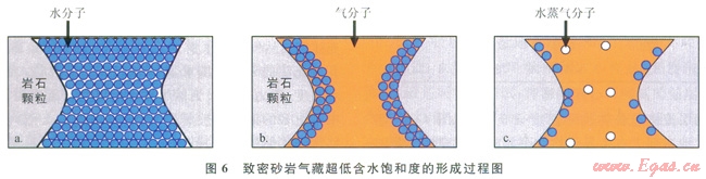 致密砂巖超低含水飽和度的形成過程如圖6所示,圖6-a為儲(chǔ)層早成巖期的機(jī)械壓實(shí)階段,此時(shí)干酪根未成熟,儲(chǔ)層孔喉中100%飽含地層水;圖6-b為儲(chǔ)層的可動(dòng)水排出階段,此時(shí)隨著干酪根成熟度的增加,生成的天然氣注入儲(chǔ)集層,驅(qū)替儲(chǔ)層的可動(dòng)水,儲(chǔ)層的含水飽和度接近于儲(chǔ)層的束縛水飽和度;圖6-c為束縛水蒸發(fā)氣化階段,此時(shí)隨著溫度壓力的增大和干氣的注入,使儲(chǔ)層的束縛水被蒸發(fā)氣化,不斷隨著天然氣的運(yùn)移攜帶出儲(chǔ)層,從而形成超低含水飽和度氣藏。