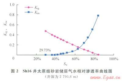 應(yīng)用氣水相滲和核磁共振2種實(shí)驗(yàn)技術(shù)方法測試束縛水飽和度。氣水相對(duì)滲透率曲線在水相滲透率為0處對(duì)應(yīng)的含水飽和度即為束縛水飽和度,圖2為Shl6井太原組砂巖儲(chǔ)層的氣水相對(duì)滲透率曲線,可以確定該砂巖儲(chǔ)層的束縛水飽和度為29.73%。