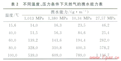 氣藏形成跨越相當(dāng)長的地質(zhì)時(shí)間,地層條件下氣藏中天然氣中的含水量取決于地層的溫度和壓力。在氣藏形成初期,溫度和壓力較低,但隨著埋藏深度增加,溫度壓力升高,天然氣攜水的能力不斷增強(qiáng)(表2),據(jù)Bennion[13]等研究,27.57MPa、100℃時(shí)天然氣蒸發(fā)和攜帶水的能力為ll36.7g/m3,而在1.013MPa、15.6℃時(shí)的能力僅為14.0g/m3,隨著溫度、壓力的增大,天然氣攜水的能力顯著增加。