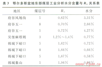 水在煤中的賦存狀態(tài)分為外在水分、內(nèi)在水分以及同煤中礦物質(zhì)結(jié)合的結(jié)晶水。煤層工業(yè)分析水分含量是指煤層中的內(nèi)在水分,內(nèi)在水分是指吸附或凝聚在煤顆粒內(nèi)部毛細(xì)孔中的水。通過對(duì)鄂爾多斯盆地東部煤層工業(yè)分析水分含量與有機(jī)質(zhì)成熟度(R。)關(guān)系時(shí)發(fā)現(xiàn)(表3),在R。>1.2%時(shí),煤中水分含量明顯降低,預(yù)示著后期烴源巖中生成的天然氣中水蒸氣的含量越少,并處在欠飽和狀態(tài),而該區(qū)上古生界煤系烴源巖演化程度普遍達(dá)到高成熟和過成熟階段,在天然氣成藏后期會(huì)有更多的干氣注入儲(chǔ)層,導(dǎo)致儲(chǔ)層中的束縛水蒸發(fā)遷移,有利于形成超低含水飽和度氣藏。