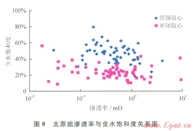 只要進(jìn)入儲(chǔ)層的水相流體的飽和度超過儲(chǔ)層水相流體的原始飽和度,就會(huì)引起儲(chǔ)層水鎖傷害。通過密閉取心含水飽和度與常規(guī)取心含水飽和度對(duì)比發(fā)現(xiàn):太原組和盒8段密閉取心含水飽和度一般低于40%(圖7、圖8);在不同滲透率區(qū)間,密閉取心含水飽和度均小于常規(guī)取心含水飽和度,表明鄂爾多斯盆地東部致密儲(chǔ)層普遍存在吸水現(xiàn)象及水基鉆井液的傷害,鉆井過程就已普遍存在著水鎖傷害。