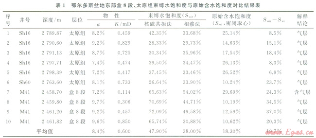 選取鄂爾多斯盆地東部的Shl6、Sh60井和M4l片盒8段、太原組的l0塊密閉取心樣品,開展氣水相滲、核磁共振實(shí)驗(yàn)測試,將密閉取心所測試的儲(chǔ)層原始含水飽和度與采用氣水相滲、核磁共振實(shí)驗(yàn)所確定的束縛水飽和度進(jìn)行了對(duì)比。