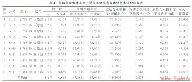 10塊巖心樣品的評(píng)價(jià)結(jié)果顯示(表4),永久性水鎖滲透率傷害率最小為26.6%,最大為47.8%,平均為35.4%;原始含水飽和度下氣相滲透率是束縛水飽和度下氣相滲透率的l.4~1.9倍,平均為1.6倍。因此設(shè)法預(yù)防和解除永久性水鎖傷害,恢復(fù)原始含水飽和度下的氣相滲透率,對(duì)提高相同儲(chǔ)層物性條件的儲(chǔ)層氣相滲透率和提高單井產(chǎn)量有著重要的意義。