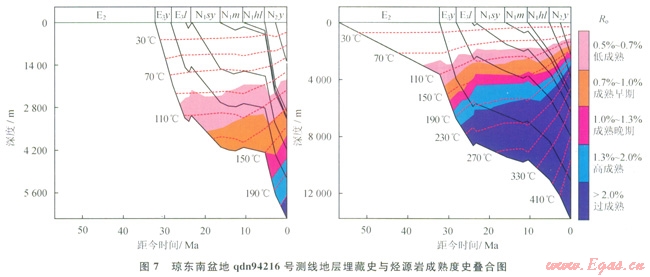 盆地的構(gòu)造沉降與埋藏史不同也導(dǎo)致成熱度演化軌跡的不同,快速的沉降與埋藏往往會對應(yīng)烴源巖的快速增熟和熱演化程度的升高。圖7為瓊東南盆地94216號測線的地層埋藏史與烴源巖成熟度史模擬疊合圖,2個人工井點分別位于凹陷邊緣與凹陷中央。可以看出:崖城組存在2期快速沉降與Ⅰ期緩慢沉降階段,同時對應(yīng)2期烴源巖的快速增熟與Ⅰ期緩慢增熟過程。早期的快速沉降發(fā)生在32.0~23.3Ma為盆地裂陷期快速拉張階段,此階段雖然發(fā)生了烴源巖的快速增熟,但凹陷邊緣烴源巖的熱演化程度尚很低,剛剛或尚未進入生油窗,凹陷中央早期演化樣度偏低,但晚期可進入生氣窗;第2期的快速沉降發(fā)生于5.4Ma以來,盆地受紅河斷裂帶構(gòu)造體制轉(zhuǎn)換的影響加速沉降,沉積了巨厚的鶯歌海組,導(dǎo)致崖城組烴源巖熱演化程度迅速增高,達到高成熟過成熟階段。