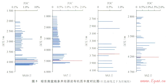前人研究已經(jīng)證實瓊東南甕地主要烴源巖為海陸過渡相和海相烴源巖2類,其中,海陸過渡相烴源巖主要指l套由煤、碳質(zhì)泥巖、泥巖組成的煤系烴源巖,其發(fā)育與三角洲平原沼澤、河湖沼澤、海岸平原沼澤等有關(guān)[13,20-22]。因此對于這類盆地?zé)N源巖的研究,不僅要像陸相湖盆中深湖烴源巖的研究那樣看凹陷中央的范圍,還要更多地考慮邊緣相帶的有效性。
