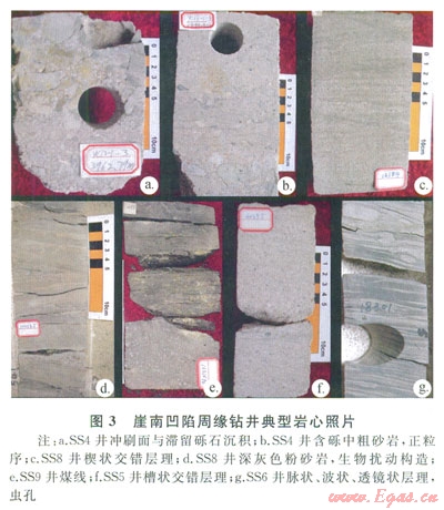 崖城l3-1氣田的其他鉆井具有同樣的沉積特征(圖3-c、3-d、3-e),與SS4井緊鄰的SS5井崖三段也有類似特點(圖3-f)。位于SS5井南部的SS6井崖三段下部為灰白色砂巖夾灰色、深灰色泥巖,往上為灰白色砂巖與灰色泥巖的互層,見清晰的反映潮汐作用的透鏡狀層理、脈狀層理與波狀層理(圖3-g),蟲孔發(fā)育,代表水體加深、受潮汐影響變強,該部位主要的成煤環(huán)境為潮坪的潮上帶。而位于崖南凹陷南部崖南低凸起的SS7井,其崖城組下部以淺灰色粗砂巖夾薄層灰黑色泥巖為主,上部為深灰色泥巖夾薄層淺灰色細砂巖或兩者的互層,見豐度不等的有孔蟲、鈣質(zhì)超微化石,有孔蟲以近岸底棲種群為主,主要粒徑大于0.125mm,早期浮游有孔蟲也具較高濃度,豐度為30~400枚/50g,并伴有少量共生的淺海介形蟲,見粒面球藻、瘤面球藻、褶皺藻等孢粉化石,反映沉積時期為濱?;蚴芟薜臏\海環(huán)境,主要的烴源巖形成環(huán)境為淺海。