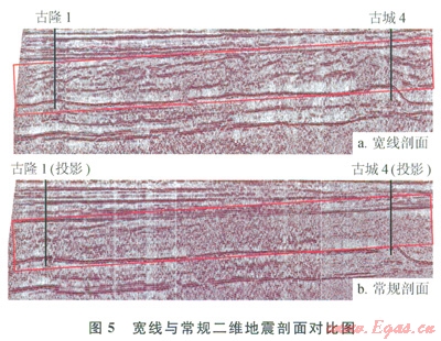 2008年首次在臺(tái)盆區(qū)沙漠腹地開展寬線攻關(guān),采集了2條共l47km的寬線,一條是古隆1—古城4井的連井剖面,一條是過古城6號(hào)構(gòu)造的近南北向剖面。寬線攻關(guān)目的有兩個(gè):①尋找層間巖溶儲(chǔ)層的地震依據(jù);②降低三維地震部署風(fēng)險(xiǎn)。實(shí)施效果表明寬線攻關(guān)效果顯著,主要表現(xiàn)為資料品質(zhì)有較大程度改善,古城4與古隆地區(qū)油氣顯示層位大體相當(dāng)(圖5),大大提高該區(qū)的地質(zhì)認(rèn)識(shí),為三維地震部署提供了依據(jù)。