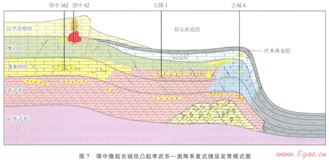 塔中62井奧陶系良里塔格組礁灘體凝析氣田的發(fā)現(xiàn)[1],促使古城低凸起的勘探思路發(fā)生重大變革;古城地區(qū)也可能具備發(fā)育臺(tái)緣帶的沉積環(huán)境和地質(zhì)條件,由此勘探思路由海相碎屑巖勘探向深層奧陶系臺(tái)緣帶勘探轉(zhuǎn)變。