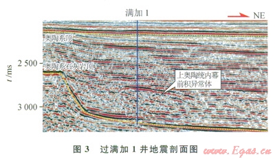 3)上奧陶統(tǒng)斜坡~陸棚相濁積巖在地震剖面上表現(xiàn)為異常反射或內(nèi)幕強(qiáng)反射,曾是多l5井的兼探層系。1995—2003年,通過塔中28、塔中29、塔中32、塔中33、滿南1等5口探井實(shí)鉆,認(rèn)為除塔中33井上奧陶統(tǒng)內(nèi)幕強(qiáng)反射被證實(shí)為玄武巖外,其他內(nèi)幕強(qiáng)反射異常體皆為濁積砂巖沉積特征。2006年,發(fā)現(xiàn)滿加1井上奧陶統(tǒng)內(nèi)幕異常反射體,并認(rèn)為是濁積砂巖沉積,針對(duì)上奧陶統(tǒng)濁積砂巖巖性圈閉鉆探滿加1井(圖3),實(shí)鉆表明上奧陶統(tǒng)內(nèi)幕異常反射與強(qiáng)反射是泥質(zhì)灰?guī)r的響應(yīng),以失利告終。盡管其間也有部分井鉆遇奧陶系碳酸鹽巖,也均未獲得突破。