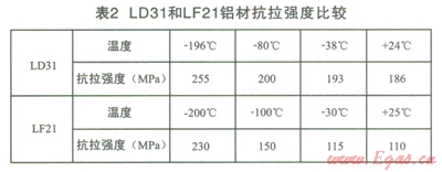 常見的氣化器材質一般為LF21(美國牌號為3003)和LD31(美國牌號為6063),鋁合金LD31材質從+24℃~-196℃強度相近,在常溫與低溫時,主體結構應力均衡、抗拉強度也是均衡的。而LF2l在常溫與低溫時,從+25℃~-200℃強度相差懸殊近l倍,抗拉強度相差較大,力學的差異也較大,具體抗拉強度參數(shù)見表2。在冷熱交替頻繁時容易造成金屬疲勞現(xiàn)象,而導致較易出現(xiàn)裂縫。但是LD31鋁材的抗氧化性能低于LF21鋁材,所以LD31鋁材需要進行抗氧化防護。氣化器材質宜選用LD31鋁型材。對于相同長度的換熱翅片管,顯然翅片管管徑大的氣化量大。