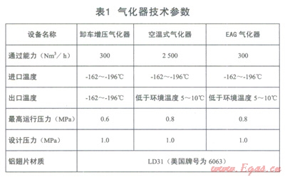 (1)卸車增壓氣化器、空溫式氣化器、EAG氣化器(技術參數(shù)見表l)。