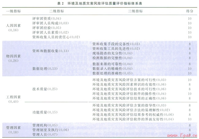 專家組根據(jù)環(huán)境及地質(zhì)災害專項風險評價的特點,在圖2所示質(zhì)量評價體系結(jié)構(gòu)的基礎(chǔ)上制訂出一套有針對性的質(zhì)量評價指標體系(表2),其中括號內(nèi)為各指標權(quán)重值。