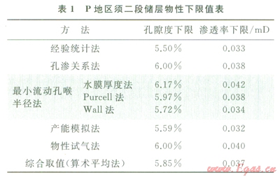 2)采用經(jīng)驗(yàn)統(tǒng)計(jì)法、孔滲關(guān)系法、最小流動(dòng)孔喉半徑法(水膜厚度法、Purcell法、Wall法)、產(chǎn)能模擬法、物性試氣法等多種方法,綜合確定出川中P地區(qū)須二段低孔低滲儲(chǔ)層的物性下限為:孔隙度下限5.85%,滲透率下限0.037mD。通過(guò)多種方法相互驗(yàn)證,避免了因方法單一而在物性下限取值時(shí)可能產(chǎn)生的較大偏差,確定出的儲(chǔ)層物性下限值得到了新近試氣資料的證實(shí),為氣藏的儲(chǔ)量計(jì)算提供了依據(jù)。