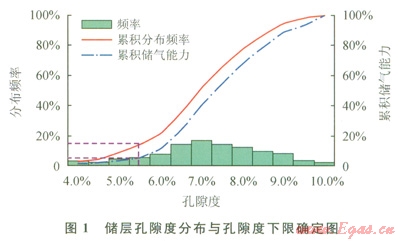 應(yīng)用經(jīng)驗(yàn)統(tǒng)計(jì)法劃分P地區(qū)須二段氣藏物性下限效果(圖l、2)。按照儲(chǔ)氣能力丟失5%為界限,確定孔隙度下限值為5.5%,此時(shí)樣品丟失率為l6.95%;按產(chǎn)氣能力丟失5%為界限,確定滲透率下限值為0.033mD,此時(shí)樣品丟失率為18.24%。以孔隙度5.5%、滲透率0.033mD作為下限值,其儲(chǔ)氣能力和產(chǎn)氣能力丟失都很小,認(rèn)為該下限值是比較合適的。