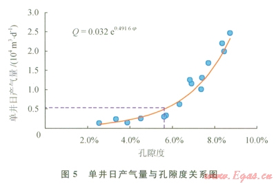 根據(jù)統(tǒng)計(jì)結(jié)果,氣層有效厚度取l5m,生產(chǎn)壓差設(shè)為5MPa,產(chǎn)能模擬實(shí)驗(yàn)結(jié)果如圖5所示。孔隙度越好的氣層,單井日產(chǎn)量越高,兩者之間具有很好的正相關(guān)關(guān)系。當(dāng)孔隙度大于5.59%時(shí),單井日產(chǎn)量能夠達(dá)到四川地區(qū)0.5×104m3/d的最低工業(yè)氣流標(biāo)準(zhǔn)。根據(jù)孔滲關(guān)系式,得到相應(yīng)滲透率下限為0.032mD。