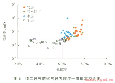 統(tǒng)計(jì)取心井試氣層段資料點(diǎn)的孔隙度和滲透率數(shù)值,結(jié)合試氣結(jié)論,繪制孔隙度—滲透率交會(huì)圖(圖6)。在資料齊全且可信度高的情況下,這種方法可以高效直觀地劃分出有效儲(chǔ)層的物性下限。將P地區(qū)須二段氣藏試氣段巖心分析孔隙度與滲透率作交會(huì)圖版,并按照試氣結(jié)論標(biāo)在圖版上,可以確定孔隙度下限值為6%,滲透率下限值為0.04mD。