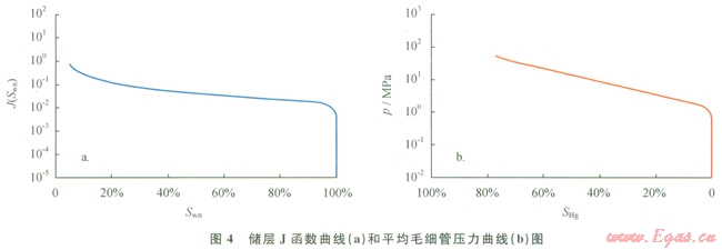 用J函數(shù)法對(duì)P地區(qū)須二氣藏4口井36塊巖心的壓汞資料進(jìn)行處理,得到J函數(shù)曲線(圖4-a)和儲(chǔ)層平均毛細(xì)管壓力曲線(圖4-b,圖中SAg為進(jìn)汞飽和度),再利用Purcell法和Wall法計(jì)算儲(chǔ)層的最小流動(dòng)孔喉半徑。