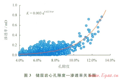 根據(jù)P地區(qū)須二段儲(chǔ)層巖心分析結(jié)果,做出孔隙度—滲透率交會(huì)圖(圖3)。分析發(fā)現(xiàn),巖心孔隙度低于6%時(shí),滲透率隨孔隙度增加而變化很小,此時(shí)孔隙以無(wú)效孔隙為主;巖心孔隙度大于6%時(shí),滲透率隨孔隙度增加也出現(xiàn)明顯增加,此時(shí)孔隙是具有一定滲透能力的有效孔隙。因此,以6%作為儲(chǔ)層與非儲(chǔ)層的孔隙度界限值,由孔滲關(guān)系式(式3)計(jì)算得出的滲透率為0.038mD。
