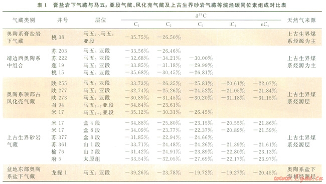 靖邊氣田西北側(cè)已有1口探井(桃38井),奧陶系馬家溝組馬五段地層保存齊全,在鉆穿馬五6亞段膏鹽巖層后,于馬五7、馬五9亞段白云巖中見到較好的含氣顯示(氣層距奧陶系頂面風(fēng)化殼超過200m),后經(jīng)酸化改造、試氣獲得l2.91×104m3/d的較高產(chǎn)工業(yè)氣流,成為盆地內(nèi)首次在膏鹽巖下深層獲得工業(yè)氣流的探井,產(chǎn)層天然氣樣品的甲烷碳同位素值為-35.75‰,乙烷碳同位素值為-26.50‰,與盆地本部來源于上古生界煤系烴源巖的奧陶系頂部風(fēng)化殼氣藏、上古生界砂巖氣藏、奧陶系中組合馬五5亞段氣藏等的天然氣烷烴碳同位素組成基本一致(表1)。這類煤系烴源氣藏的甲烷碳同位素值一般在-30‰~-36‰之間,乙烷碳同位素值為-23‰~-30‰之間[18-22],證實(shí)了膏鹽巖下圈閉的有效性及氣源主要來自上古生界煤系烴源巖的基本成藏特征。另外,近期通過靖邊氣田勘探早期鉆入膏鹽巖下深層的探井復(fù)查分析,也發(fā)現(xiàn)l0余口探井在膏鹽巖下有一定的含氣顯示,但由于當(dāng)初勘探重點(diǎn)是奧陶系頂部的馬五1+2亞段風(fēng)化殼氣藏,對馬五5亞段及以下的中下組合含氣層系認(rèn)識不足,加之個別井試氣效果不理想,也就沒有進(jìn)一步深入勘探之。