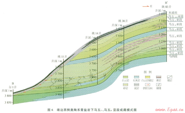 前已述及,馬五6膏鹽巖下發(fā)育馬五7、馬五9亞段及馬四段等多個儲集層段,其間又為馬五8、馬五10亞段等蒸發(fā)巖組合分隔,各自都具有相似的成藏地質(zhì)背景,因而都具有一定的成藏潛力。其次,即使在馬五8、馬五10亞段乃至馬五6亞段等蒸發(fā)巖層段中也常夾有一定儲集性的白云巖夾層,它們雖在橫向上規(guī)模相對較小,但在局部也可能形成有效的工業(yè)性聚集,對于膏鹽巖下的勘探也有一定的實(shí)際意義。