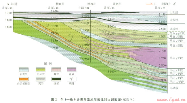 2)燕山期構(gòu)造反轉(zhuǎn),盆地東部區(qū)域性抬升,形成東高西低的構(gòu)造格局,為進(jìn)入西側(cè)“供烴窗口”區(qū)的煤系烴源生成的天然氣在膏鹽下白云巖中向東運(yùn)移提供了有利條件。