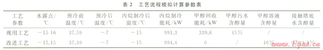 現(xiàn)用注醇工藝流程模擬與改進(jìn)后注醇工藝流程模擬原料氣的溫度、壓力、流量以及原料氣組成完全相同,而且保持板翅換熱器與丙烷蒸發(fā)器的溫降也相同。與此同時(shí),現(xiàn)用注醇工藝與改進(jìn)后注醇工藝外輸干氣的露點(diǎn)分別為-l5.16℃和-15.15℃,幾乎相同,在保證沒(méi)有天然氣水合物形成、取最小注醇量的基礎(chǔ)上對(duì)兩種工藝進(jìn)行對(duì)比分析,工藝參數(shù)對(duì)比見(jiàn)表2。