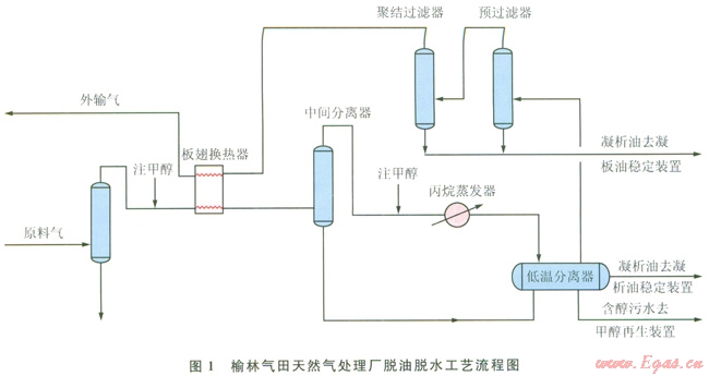 中國(guó)石油長(zhǎng)慶油田公司榆林氣田(以下簡(jiǎn)稱(chēng)榆林氣田)天然氣處理廠采用低溫分離法進(jìn)行脫油、脫水,使天然氣的水含量、烴露點(diǎn)符合商品天然氣質(zhì)量指標(biāo)和管道輸送要求[1-2]。其工藝流程如圖1所示。