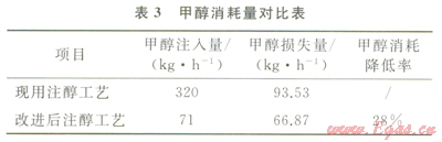 3)改進(jìn)后注醇工藝注醇量減少,甲醇利用率提高。