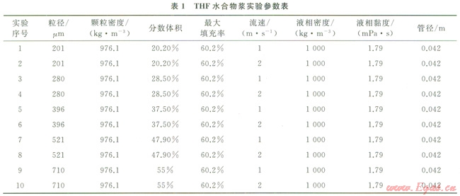 王武昌等[11]對四氫呋喃(THF)水合物在水平管道中的流動狀態(tài)進(jìn)行了大量實(shí)驗(yàn)研究(表1),研究內(nèi)容包括顆粒粒徑、濃度以及流速等對水合物漿流動狀態(tài)的影響,筆者以其實(shí)驗(yàn)數(shù)據(jù)為參照,對模型計(jì)算結(jié)果進(jìn)行了對比。