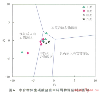 Roser和Korsch[28]曾提出通過沉積巖中Ti、Fe、Mg、Na、K氧化物含量對Al2O3含量比值作為判別函數(shù),來區(qū)分沉積巖碎屑物源區(qū)是鐵鎂質(zhì)、中性、長英質(zhì)火山巖和石英巖4種沉積物源區(qū)(圖6)。判別函數(shù)F1=30.638TiO2/Al2O3-12.54Fe2O3/Al2O3+7.329MgO/Al2O3+12.031Na2O/Al2O3+35.402K2O/A12O3-6.382;判別函數(shù)F2=36.500TiO2/Al2O3-10.879Fe2O3/Al2O2+30.875MgO/Al2O3-5.404Na2O/Al2O3+11.112K2O/Al2O3-3.89[29-30]。從圖6中看出,祁連山凍土區(qū)4類碳酸鹽巖中碎屑大部分為中性火山巖物源區(qū)。其中,第Ⅱ類碳酸鹽巖中的碎屑部分顯示中性火山巖物源區(qū)與鎂鐵質(zhì)火山巖物源區(qū)交界處,更偏于鎂鐵質(zhì)火山巖物源區(qū)。這與前述分析相一致,即該類碳酸鹽巖中黏土類礦物在沉積中貢獻(xiàn)較小,該類碳酸鹽巖中åREE平均含量最低(103.61mg/g),顯示為Eu正異常。
