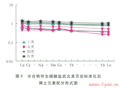 比值主要集中在1.04~1.30,反映了稀土元素中的輕稀土元素、重稀土元素的富集程度和分餾程度不強(qiáng)(表4)。4類碳酸鹽巖樣品中雖然輕稀土、重稀土分異不強(qiáng),但呈現(xiàn)Eu異常;其中第Ⅰ類和第Ⅱ類碳酸鹽巖樣品中Eu表現(xiàn)一定程度的正異常特征(其平均Eu分別約為0.66和0.70),而第Ⅲ、Ⅳ類碳酸鹽巖樣品中Eu表現(xiàn)為負(fù)異常(其平均Eu分別約為l.18和1.38);第Ⅱ類碳酸鹽巖樣品中重稀土(åHREE)平均含量最低(約為21.67mg/g),而第Ⅰ、Ⅲ、Ⅳ類碳酸鹽巖樣品中重稀土(åHREE)平均值分別為30.45mg/g、42.65mg/g、48.90mg/g。